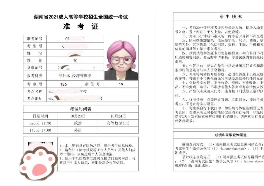 2021年湖南省成人高考准考证模板